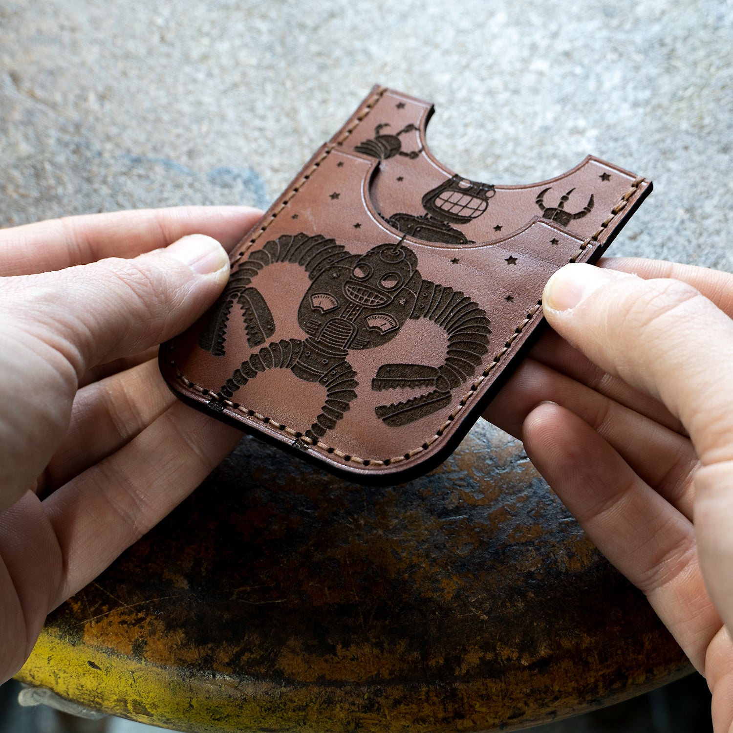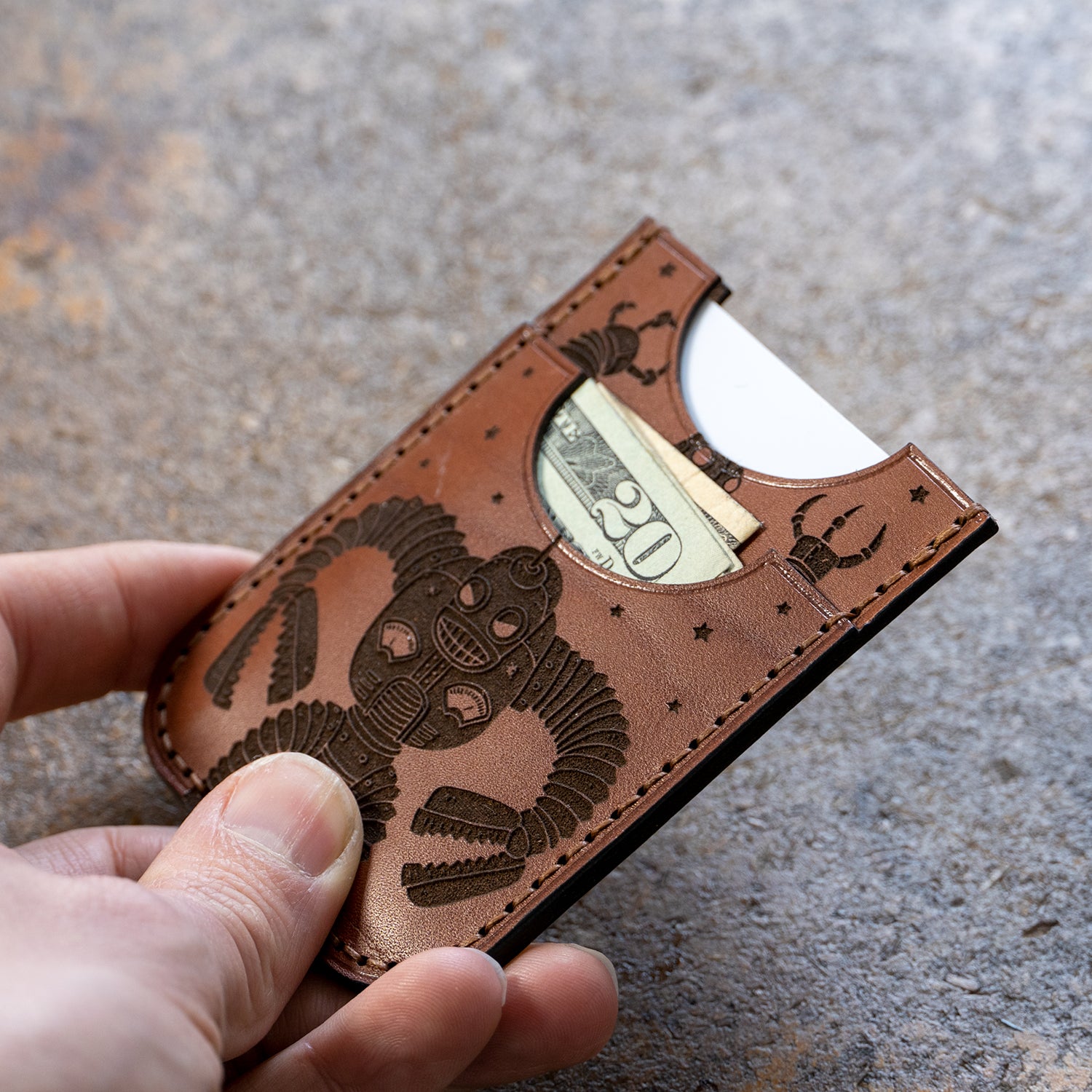 Very simple and beginner friendly card wallet design. Features 1 larger section for storing credit cards and a smaller pocket on the front for cards or folded cash. You can even put another pocket on the back for a symmetrical design. The template set comes with (2) pieces with stitching holes cut out if you choose to use them.