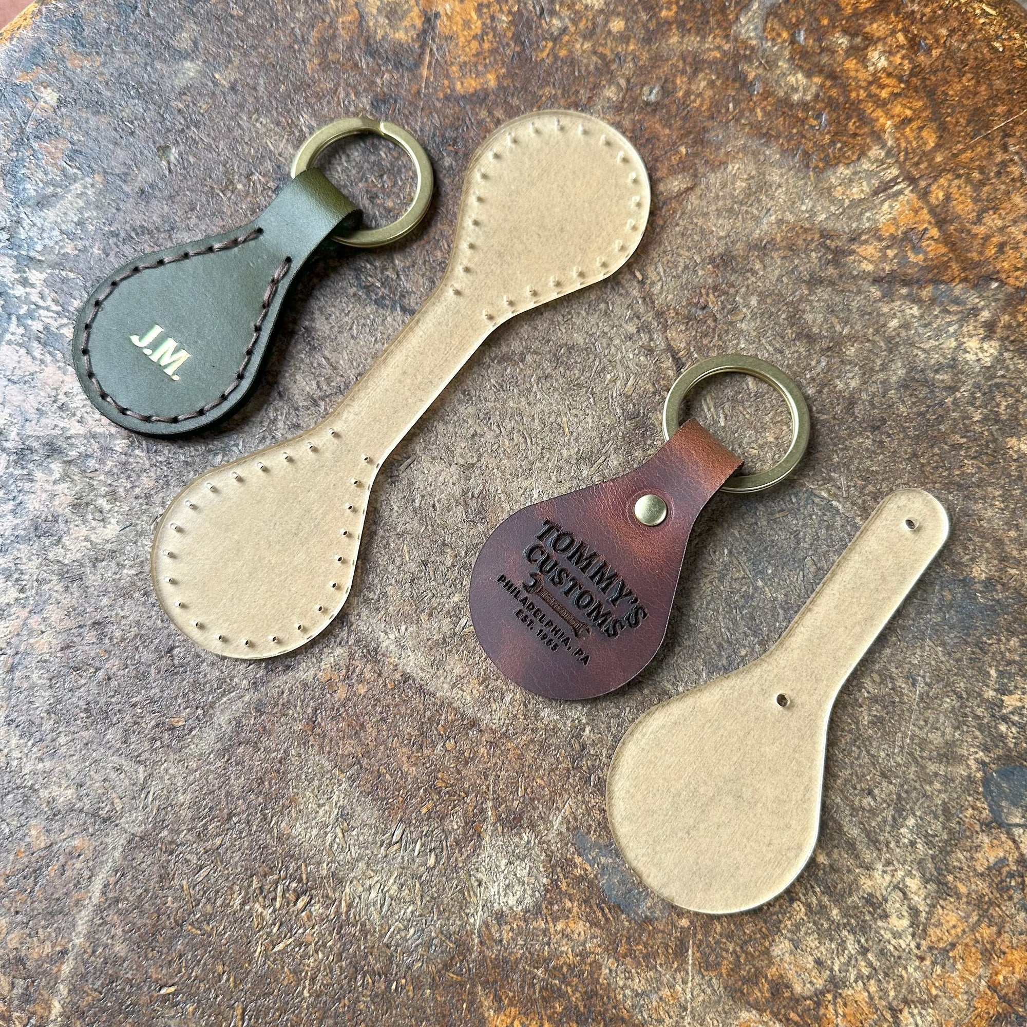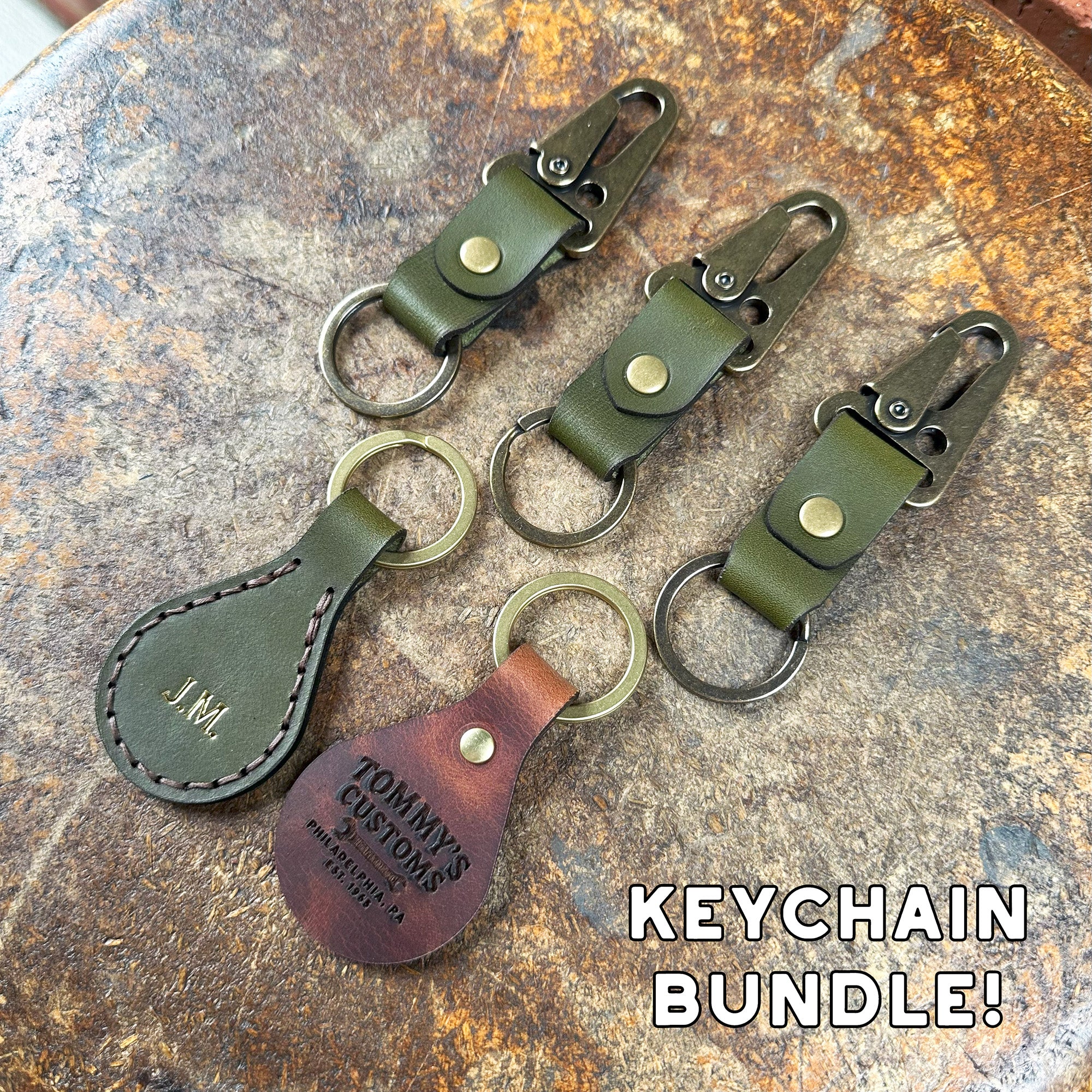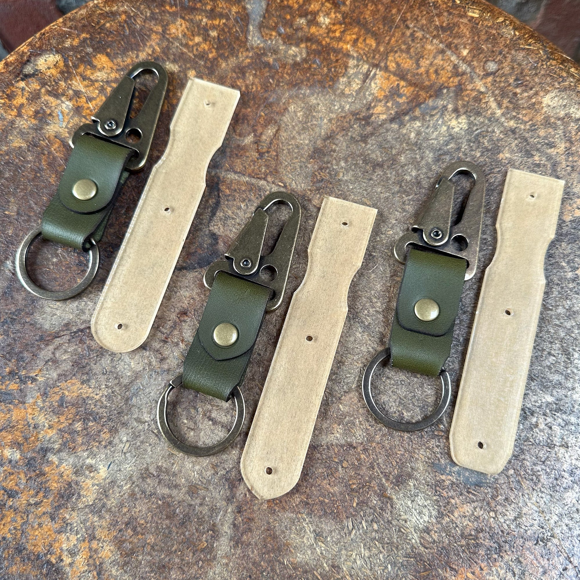 Keychains are the best way to make use out of all those tiny leftover pieces of leather you cant use for anything else. Our Keychain Set gives you a couple different options. A simple riveted key fob, a stitched key fob, and 3 versions of a trigger snap style keychain that is designed to hook on your pant loop or bag.