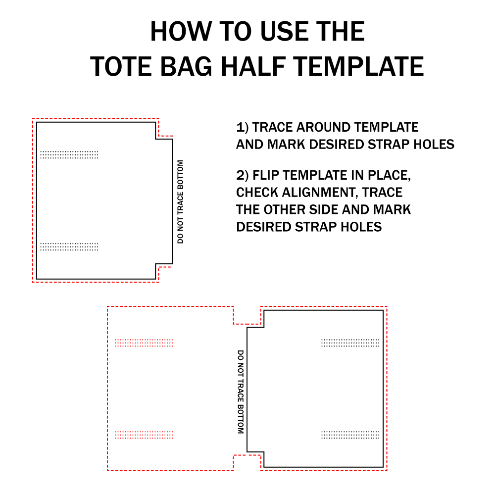 - Main body panel - This piece will create your tote bag body. Please remember this template will be half of your complete design. You need to flip and align to trace complete the other side. This will be covered thoroughly in the DIY instructions if you need assistance. Tote body panel also comes with strap alignment grid holes to mark through the template. This allows you to place the straps anywhere you want and keep them straight.