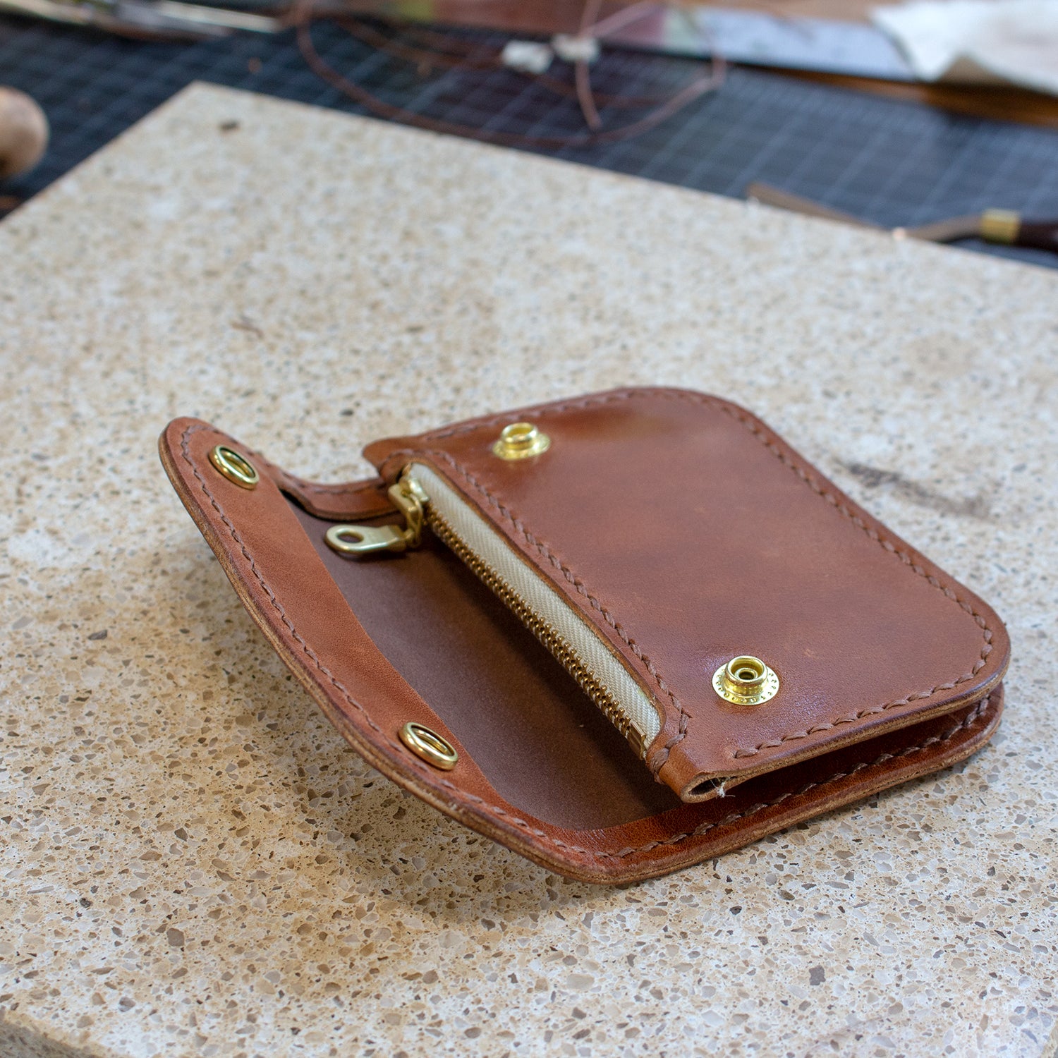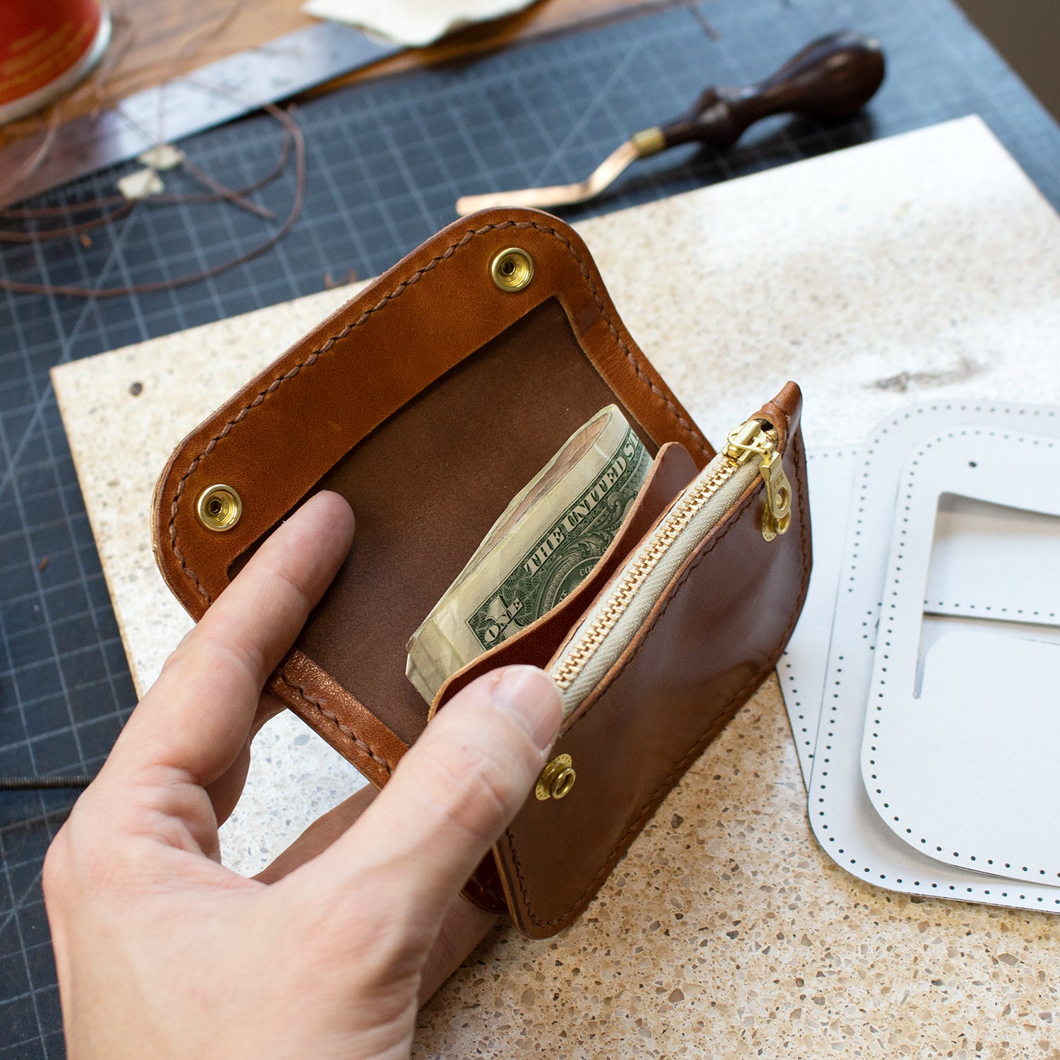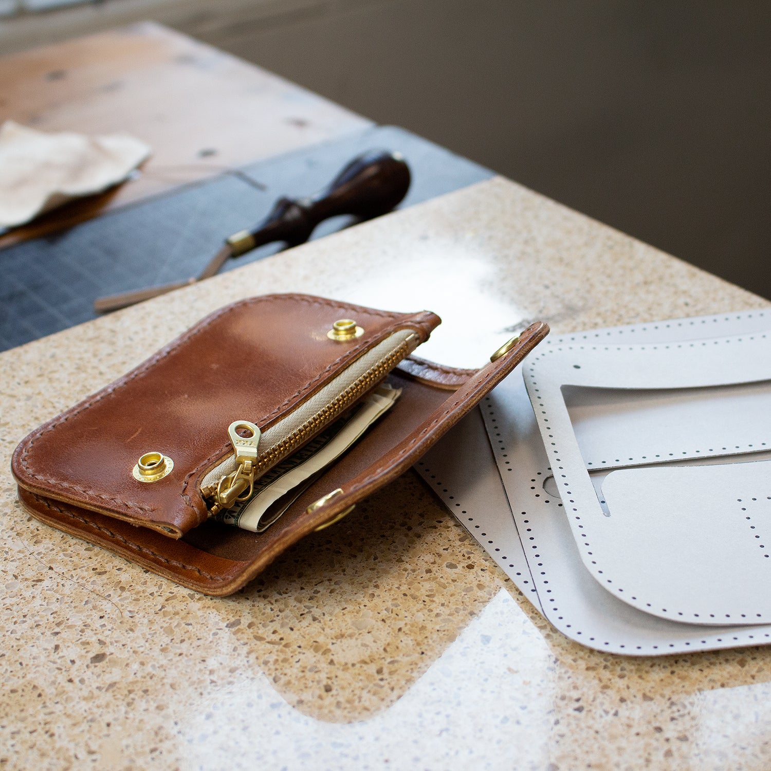 It's not a full size trucker wallet but jussssst right for fitting in your front or back pocket. This template set features a zippered section for stashing change or cards and a cash stash section in the back. There are also (2) 4" YKK zippers included to get you started.
