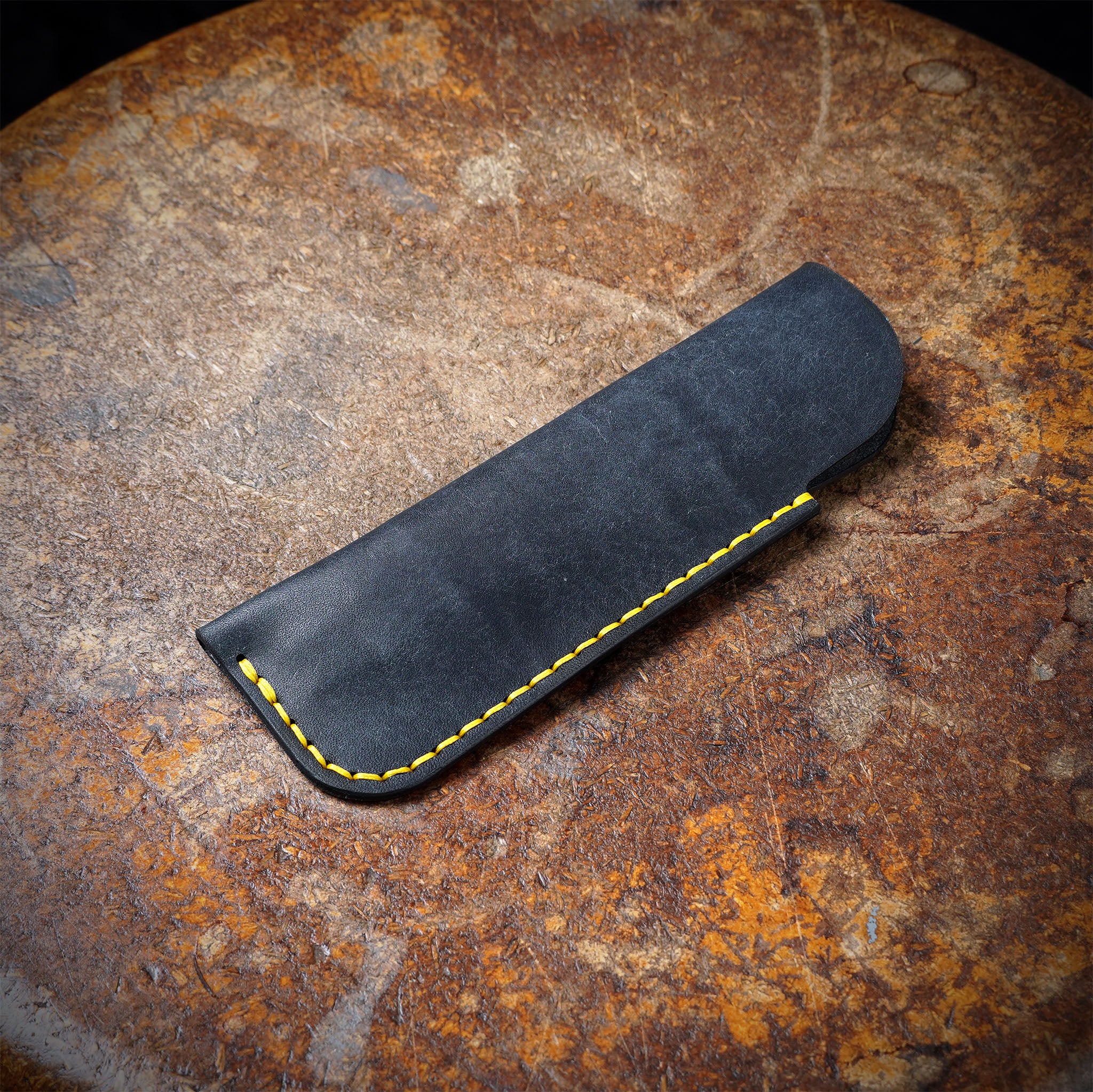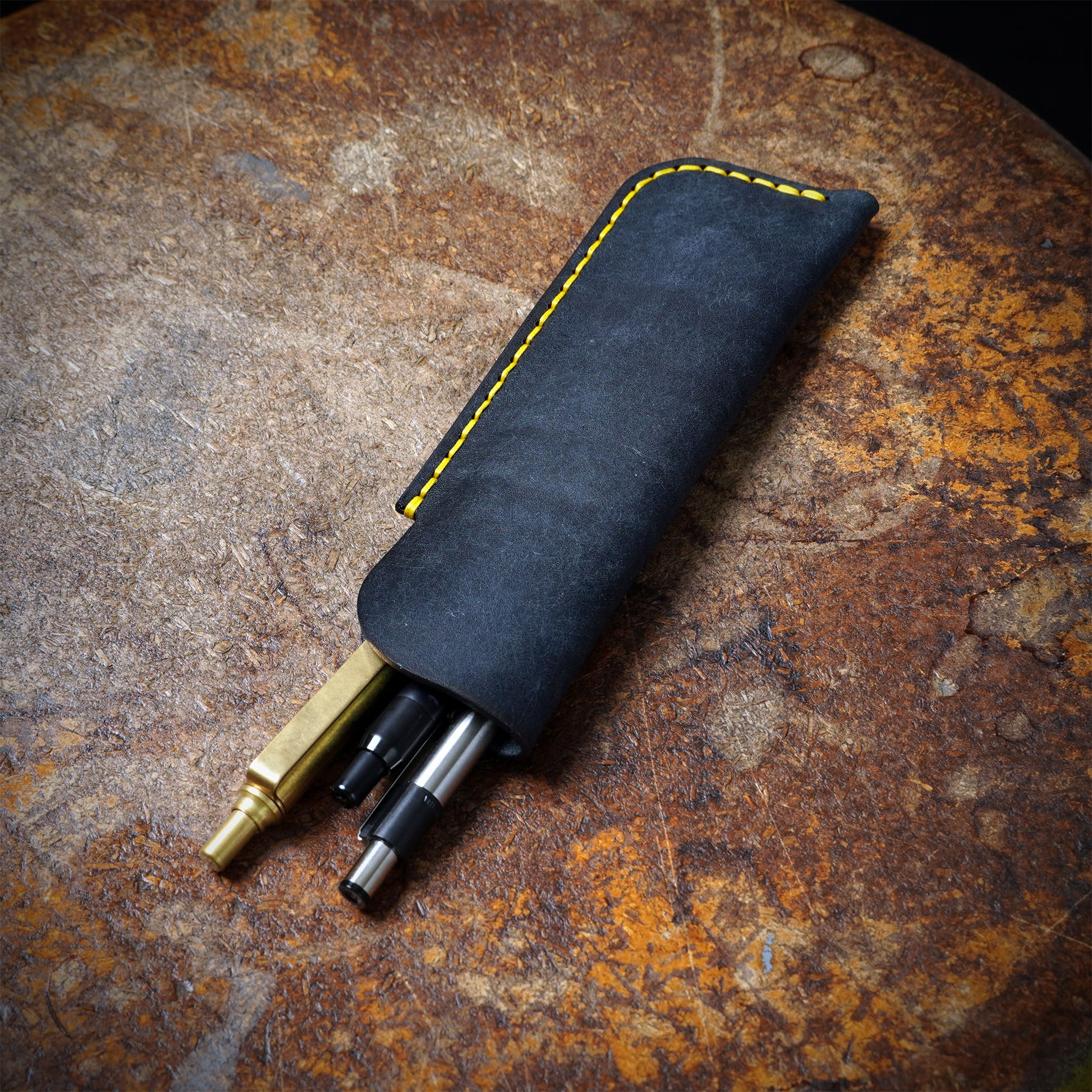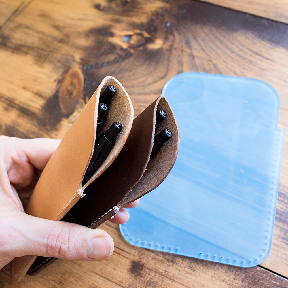 Everybody has pens, might as well have a nice leather sleeve to keep them in. This folded-over pen sleeve template gives enough space to hold 2-4 (maybe more depending on size) pens for easy convenient storage on your desk or in your bag.