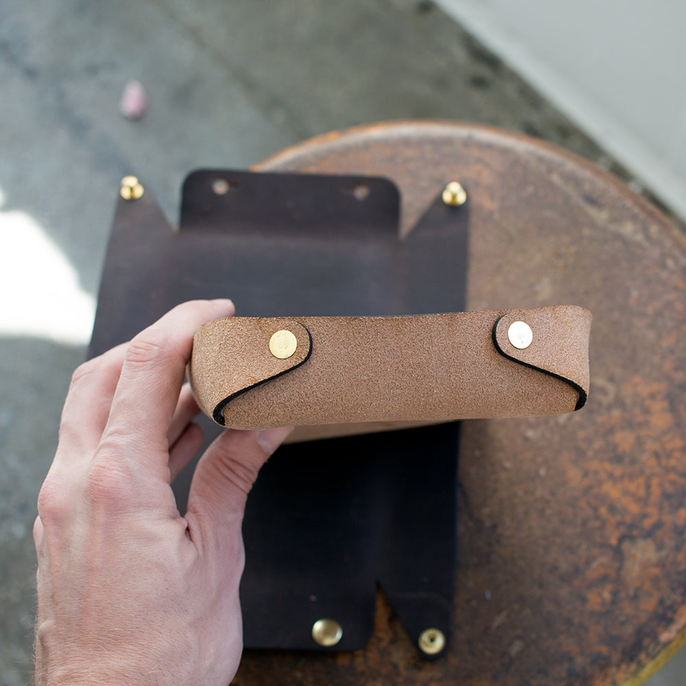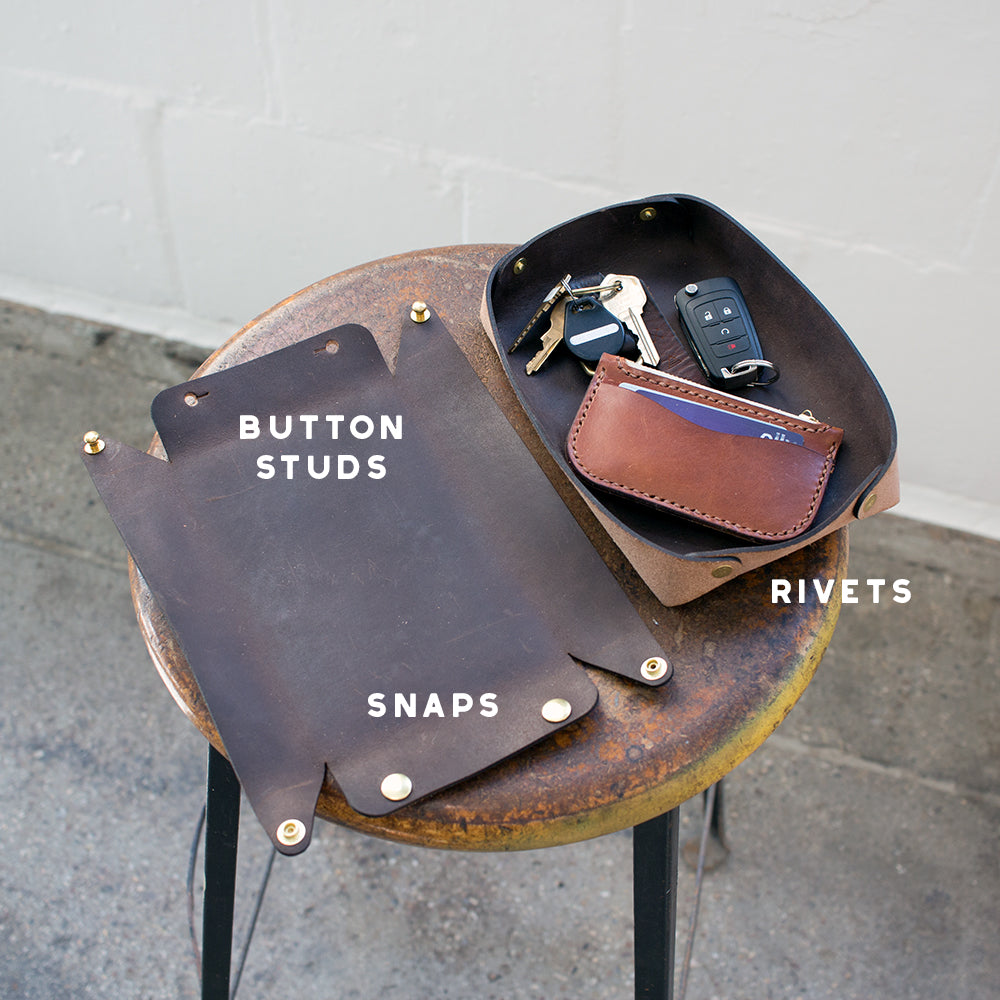 Trace around the perimeter of the one piece template and mark the holes for attachment. If you would like a permanently closed tray you can use brass or copper rivets to quickly secure. If you would like the option to deconstruct your tray (i.e. a "travel tray"), you can use snap fasteners or button studs.