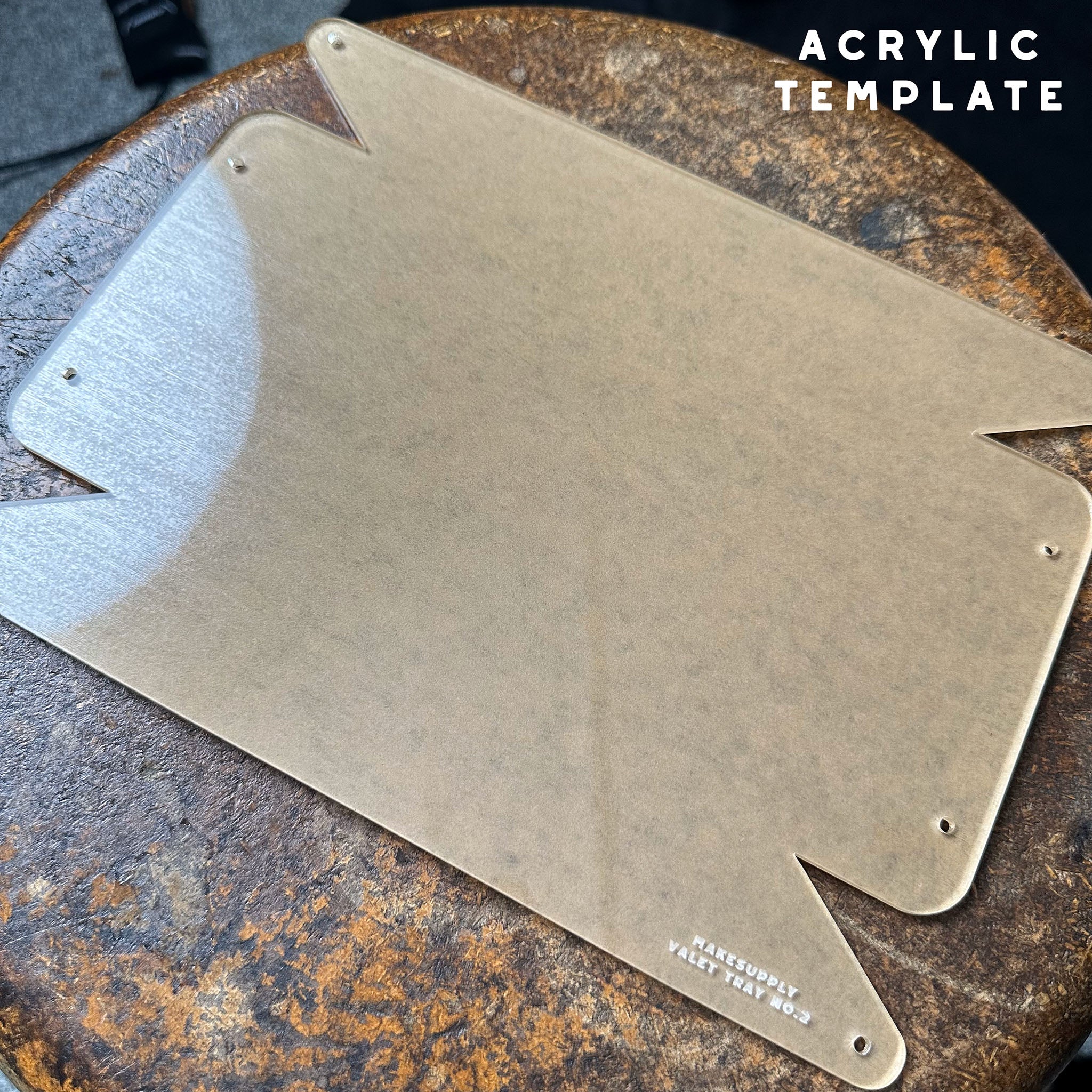 The finished template allows for roughly 8" x 5.5" usable space in the interior of the tray. This template was designed for use with heavier weight leathers (i.e. 6 - 9 oz) but should work fine with lighter weights.