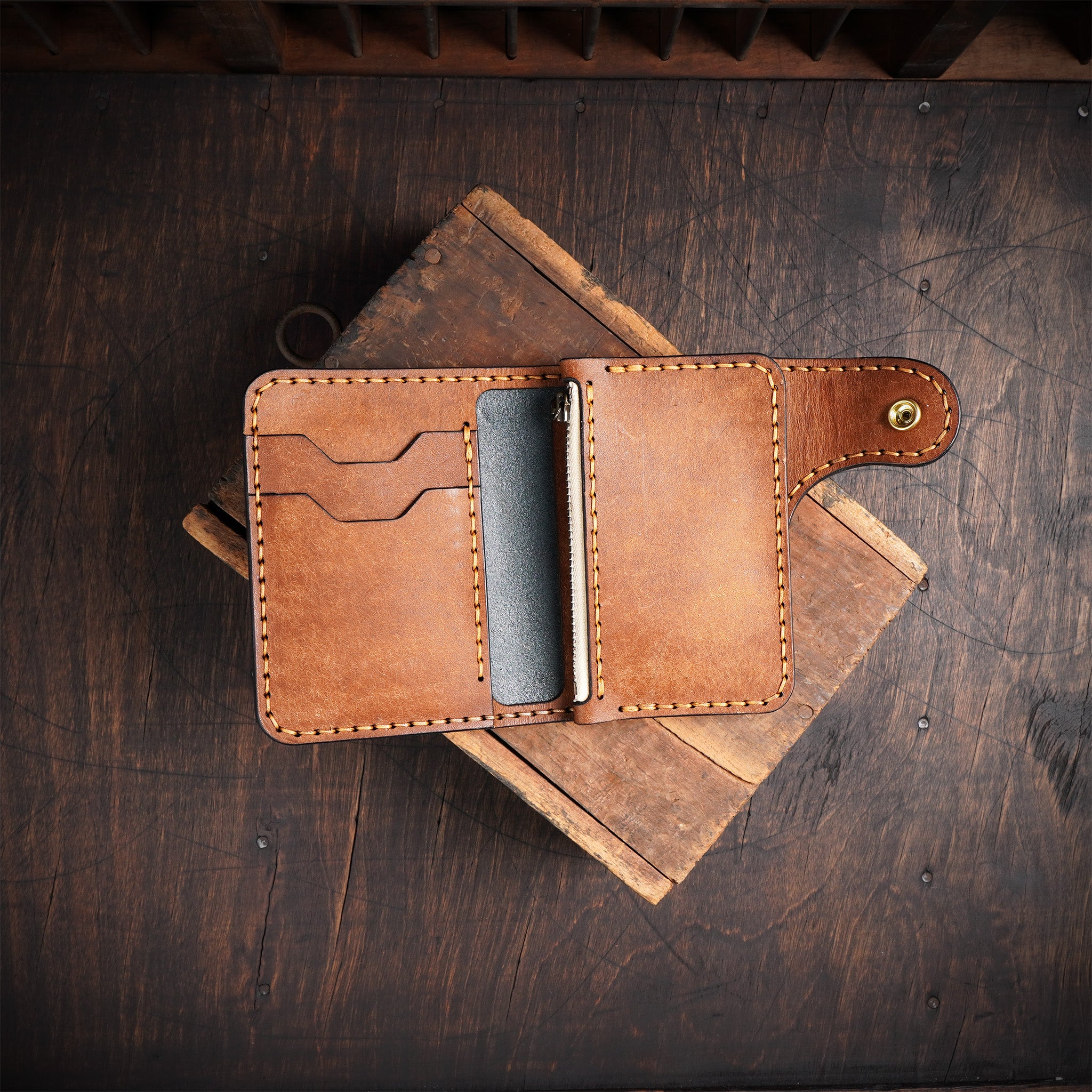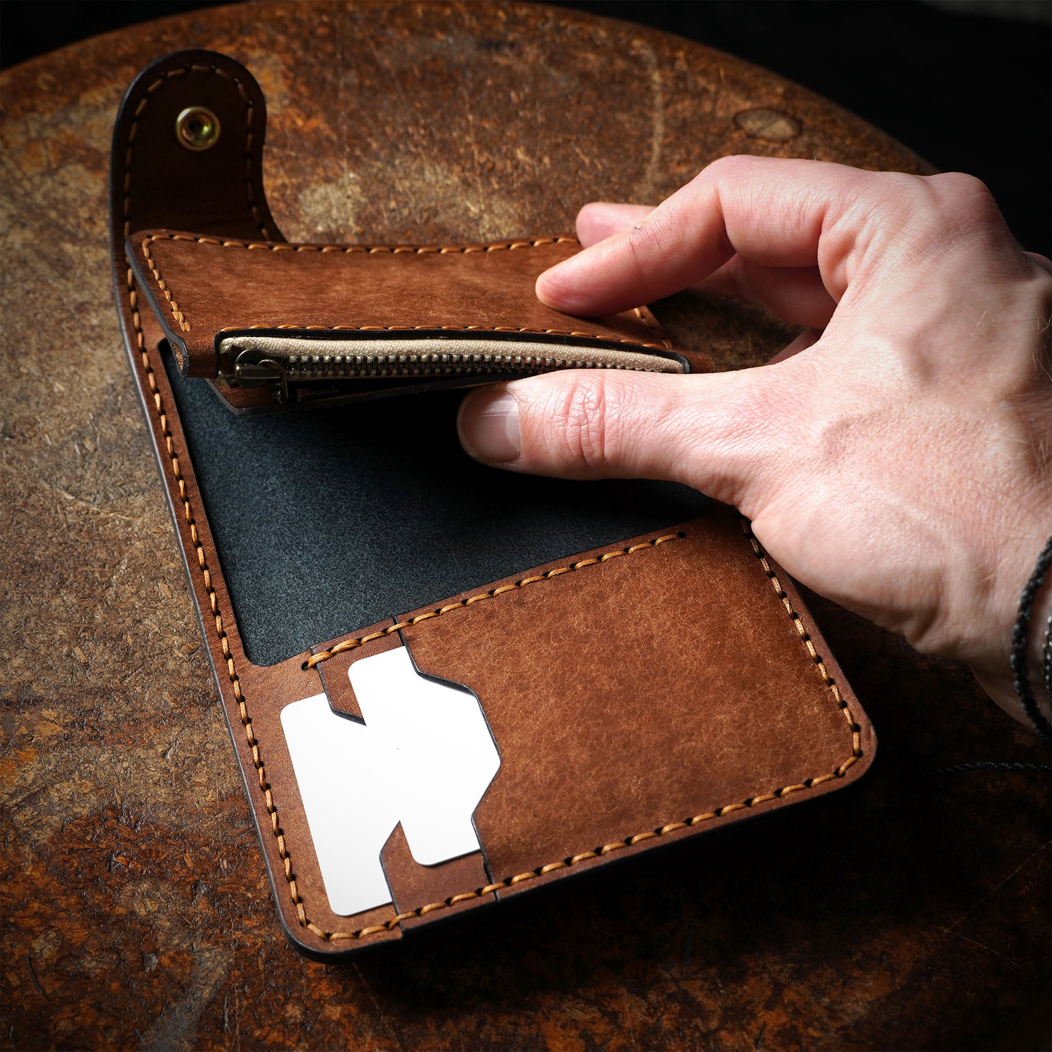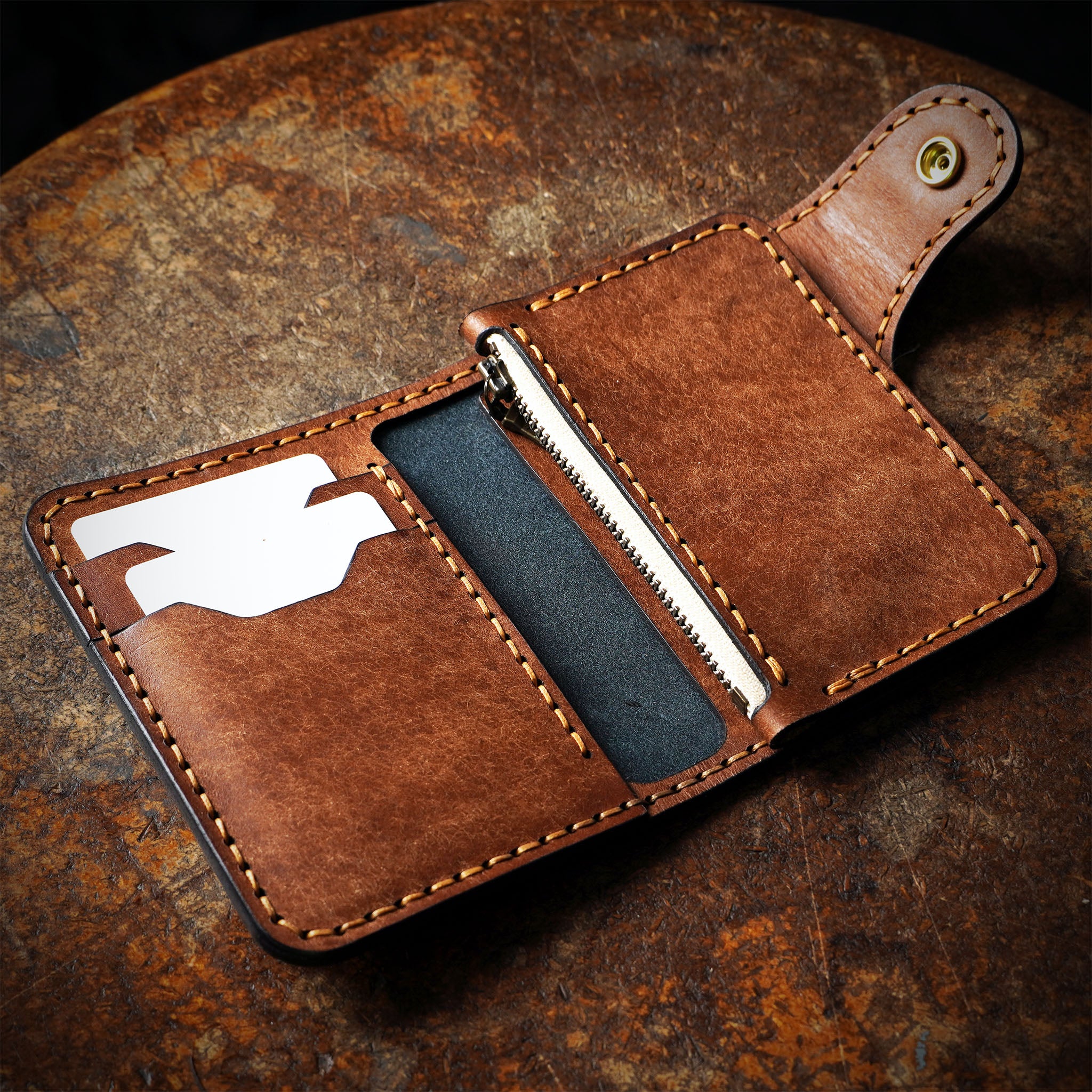 The Vertical Bi-Fold Wallet No. 2 Template Set is a compact wallet design that can hold cards, folded cash, and coins in its zippered compartment. The right side of the template has markings to connect the zippered compartment or 2 card slots, depending on your preference.